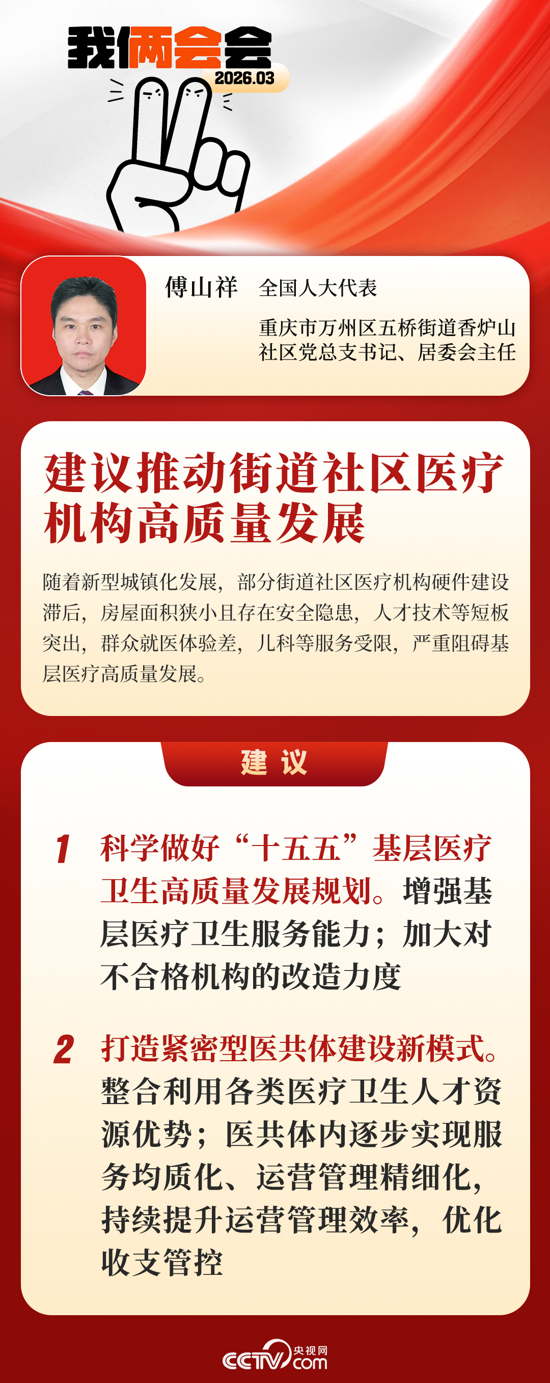 对此,全国人大代表、重庆市万州区五桥街道香炉山社区党总支书记、居委会主任傅山祥建议,增强基层医疗卫生服务能力;加大对不合格机构的改造力度;打造紧密型医共体建设新模式。整合利用各类医疗卫生人才资源优势。医共体内逐步实现服务均质化、运营管理精细化,持续提升运营管理效率,优化收支管控。